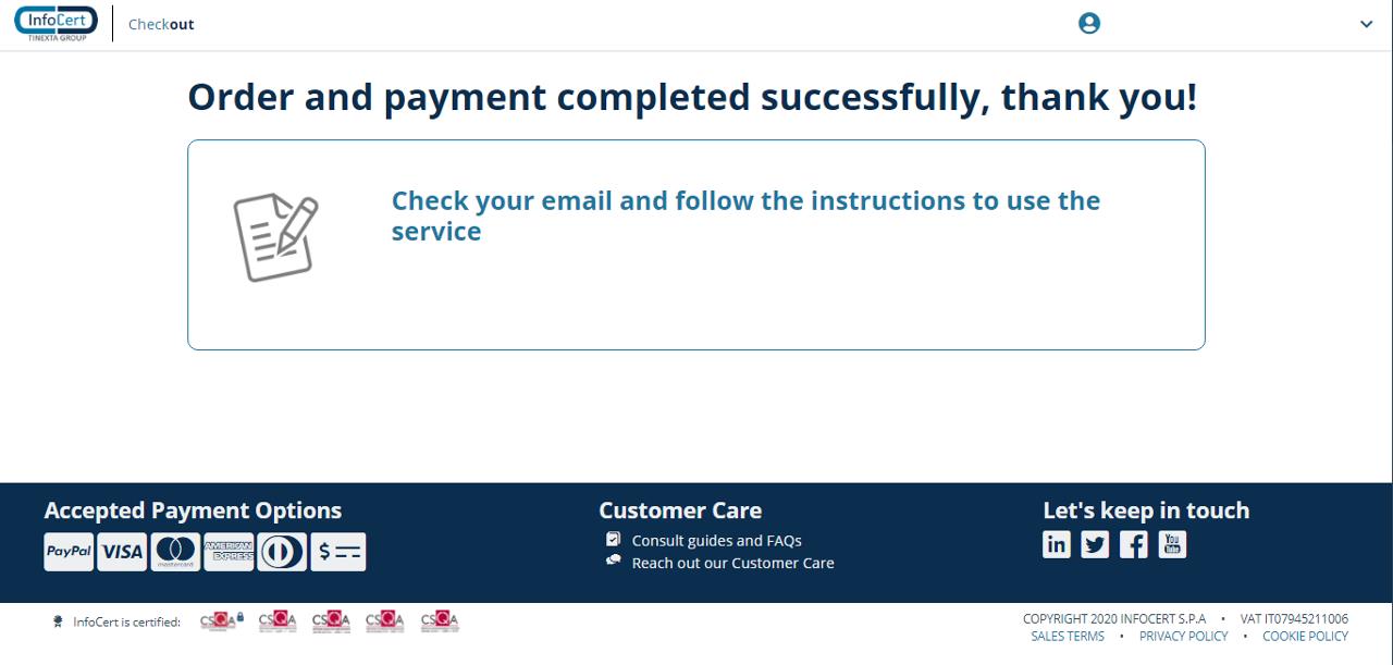 The system will confirm the purchase and you will receive a confirmation email at the email address entered in the InfoCert Store.