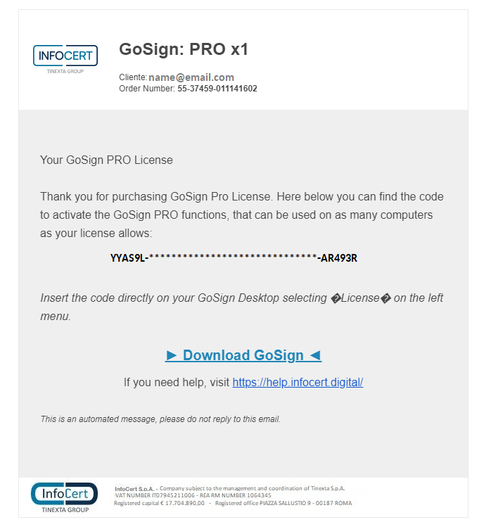 The email contains the License Key that will unlock GoSign Desktop PRO's advanced features.