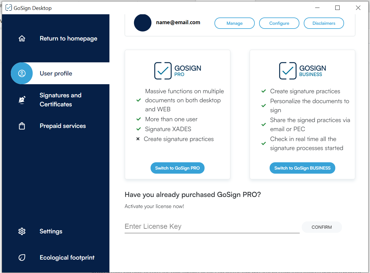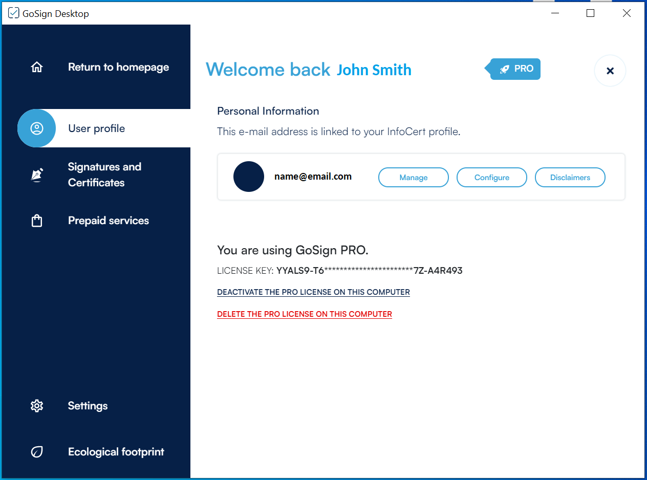 In this section you have to enter the code number of the PRO license that was sent by email from InfoCert and then proceed with the activation by clicking on the Confirm button.