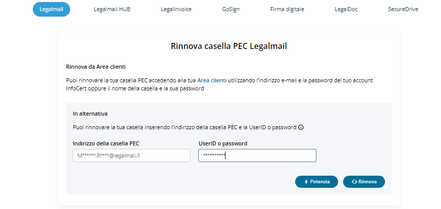 In alternativa, all'interno dell'Area Clienti è possibile trovare gli estremi della casella Legalmail da rinnovare e il pulsante Rinnova con il quale passare alla fase di acquisto.