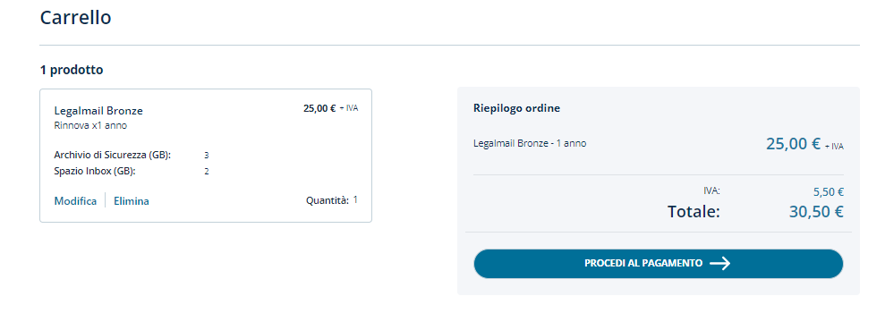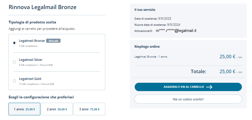Il Negozio offre la possibilità di rinnovare la casella certificata con le stesse caratteristiche che aveva al momento dell’acquisto, per un anno o per un periodo più lungo di tempo.