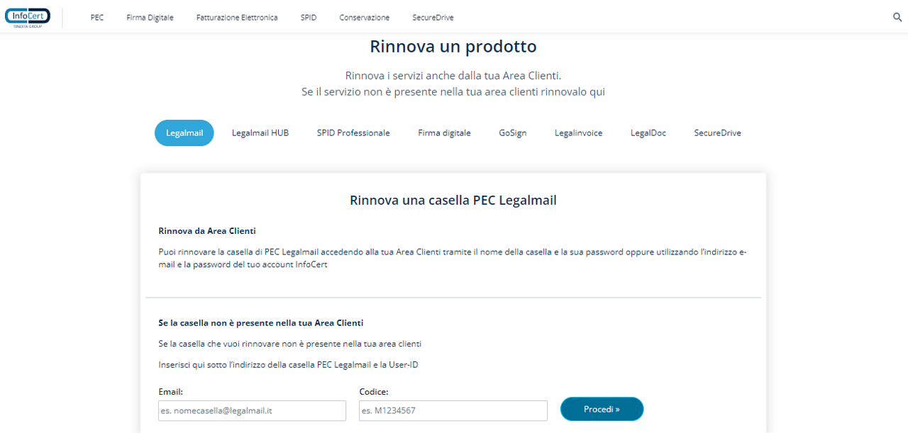 Una volta deciso di procedere con il rinnovo della casella, sarà possibile iniziare l’attività collegandosi alla pagina del sito InfoCert dedicata ai rinnovi.