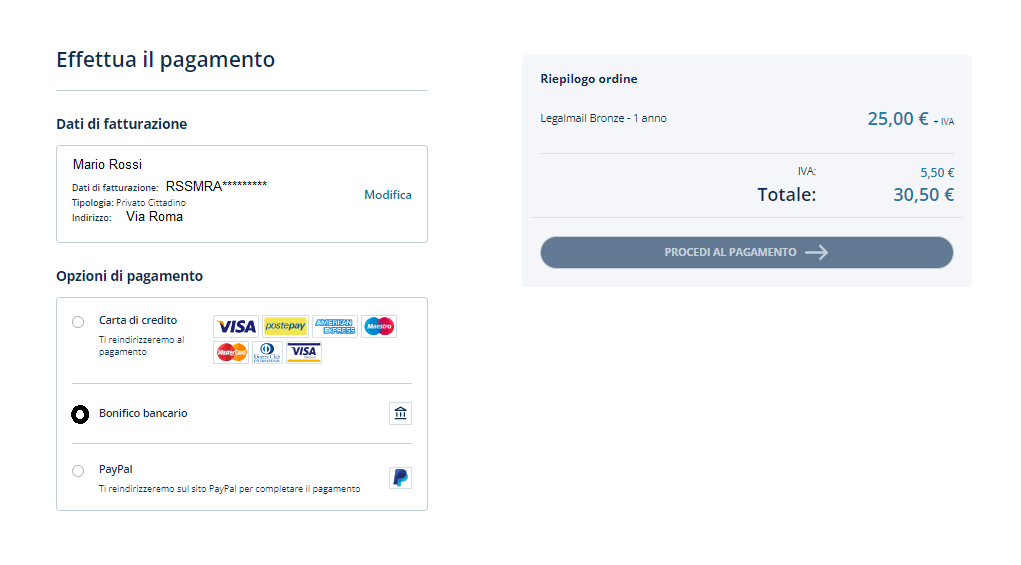 Il passo successivo consiste nella verifica e conferma dei dati di fatturazione nonché nella scelta del sistema di pagamento che si preferisce, tenendo presente che la scelta del bonifico comporterà il buon esito dell’acquisto solo a ricezione del pagamento da parte di InfoCert.