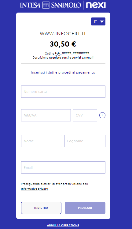 Un clic sul pulsante Procedi al pagamento trasferisce sul sistema di pagamento della banca di appoggio al Negozio InfoCert.