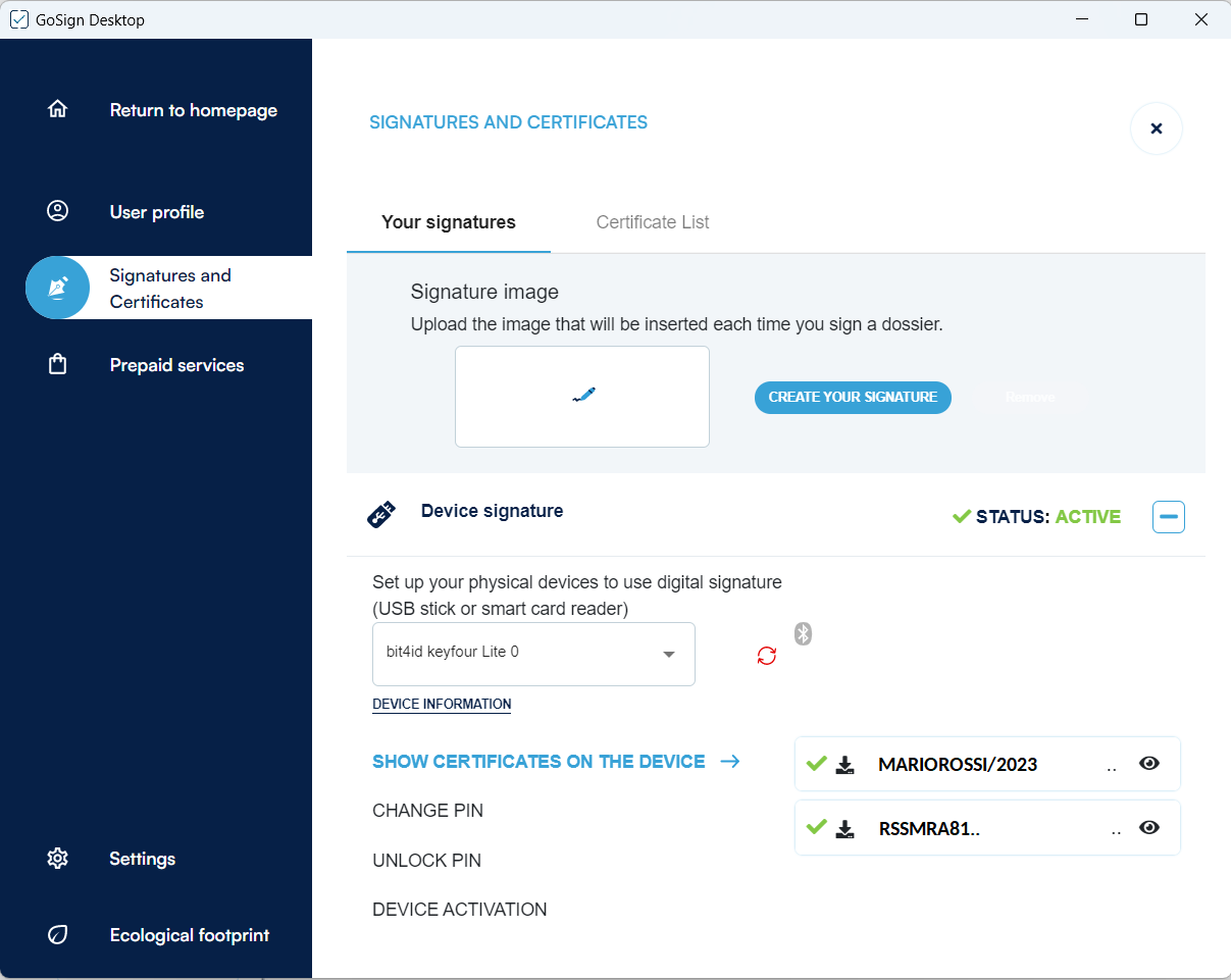 Once I launch the GoSign Desktop software, I find the Signatures and Certificates feature. Next, I select the device signature.