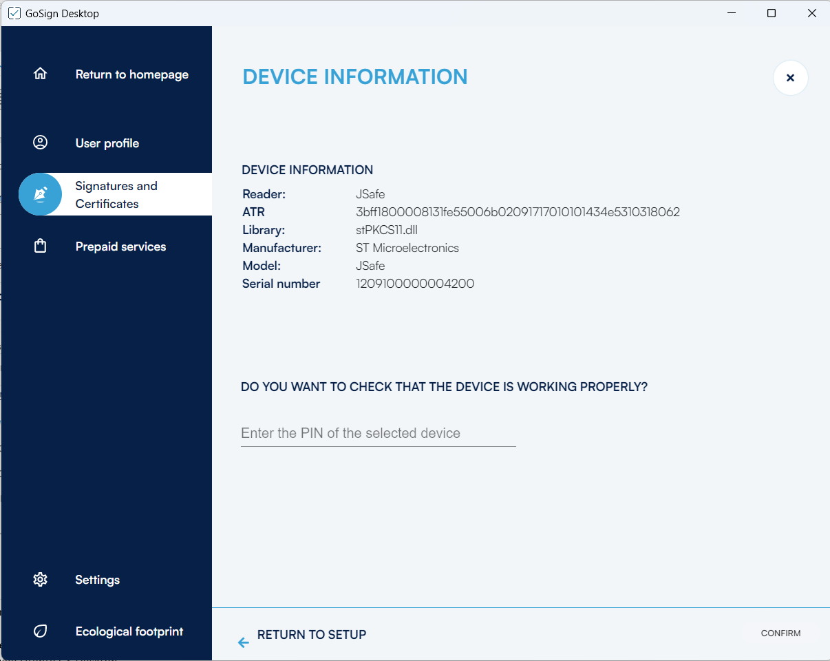 By clicking on the Back to Configuration link, you can go back to the section dedicated to signature devices, or by clicking on the X at the top right you can go back to the GoSign Desktop GoSign homepage.
