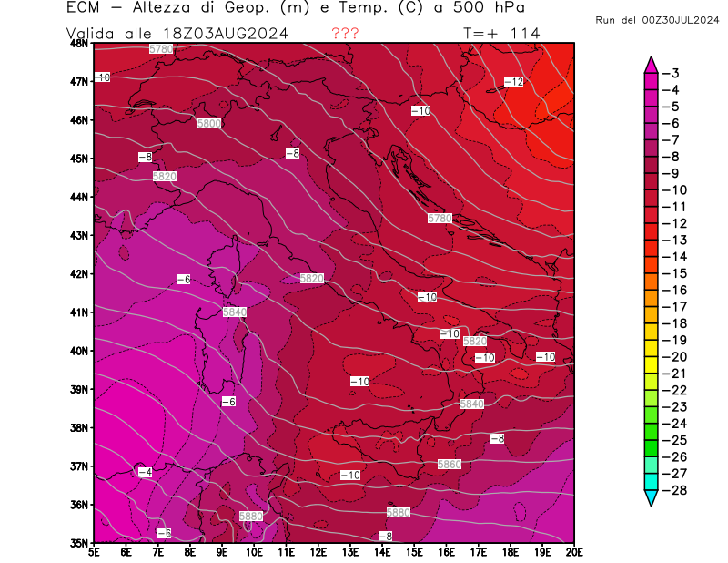Altezza di geopotenziale (m) e Temperatura (°C) a 500hPa
