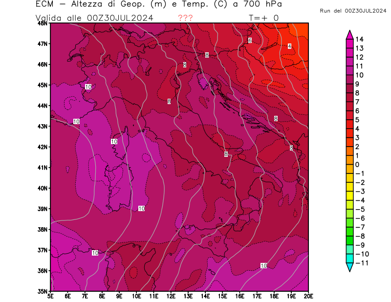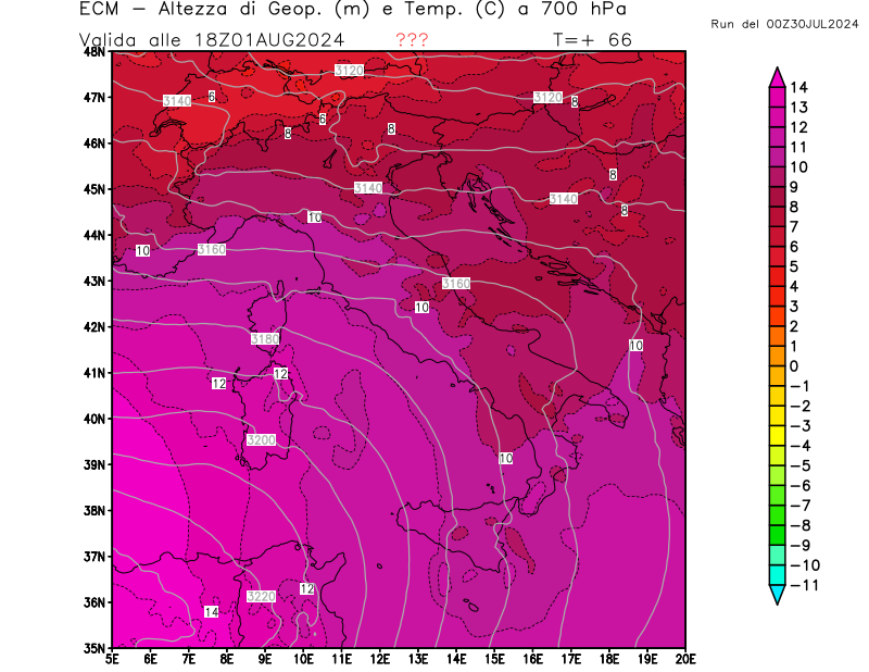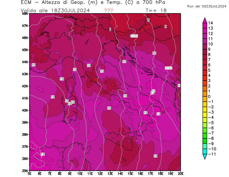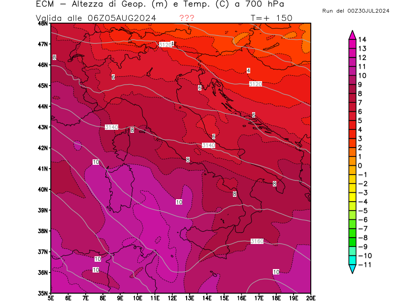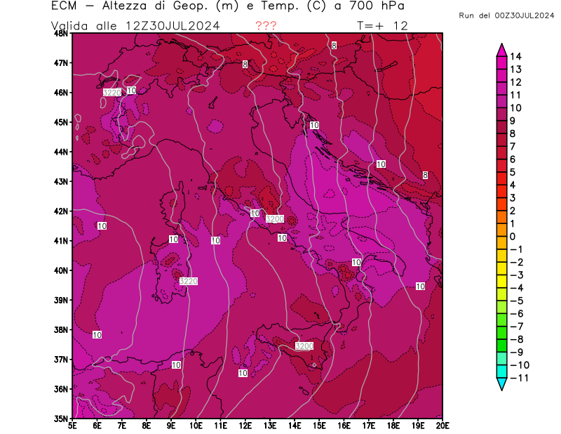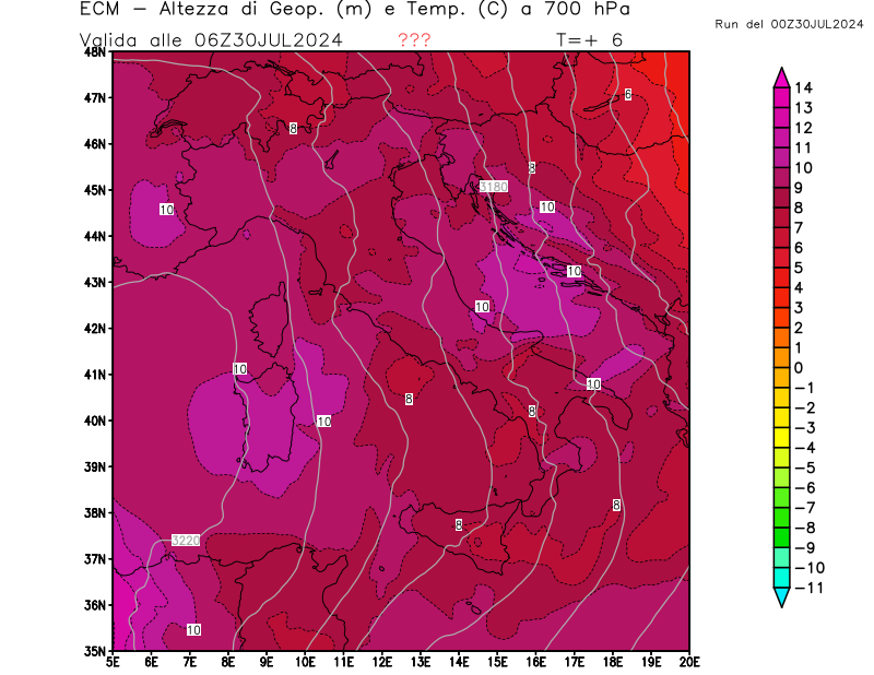 Altezza di geopotenziale (m) e Temperatura (°C) a 700hPa