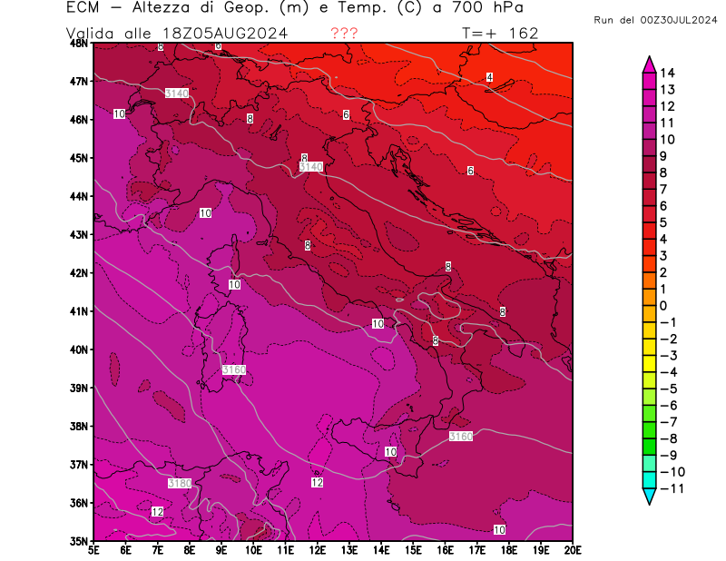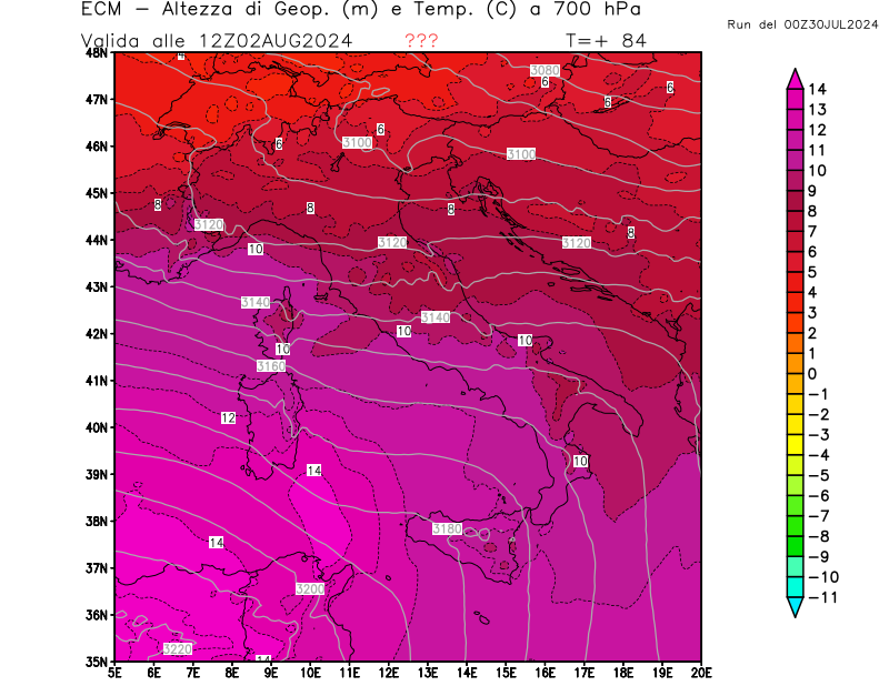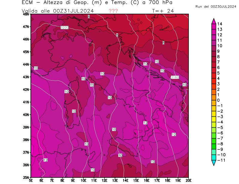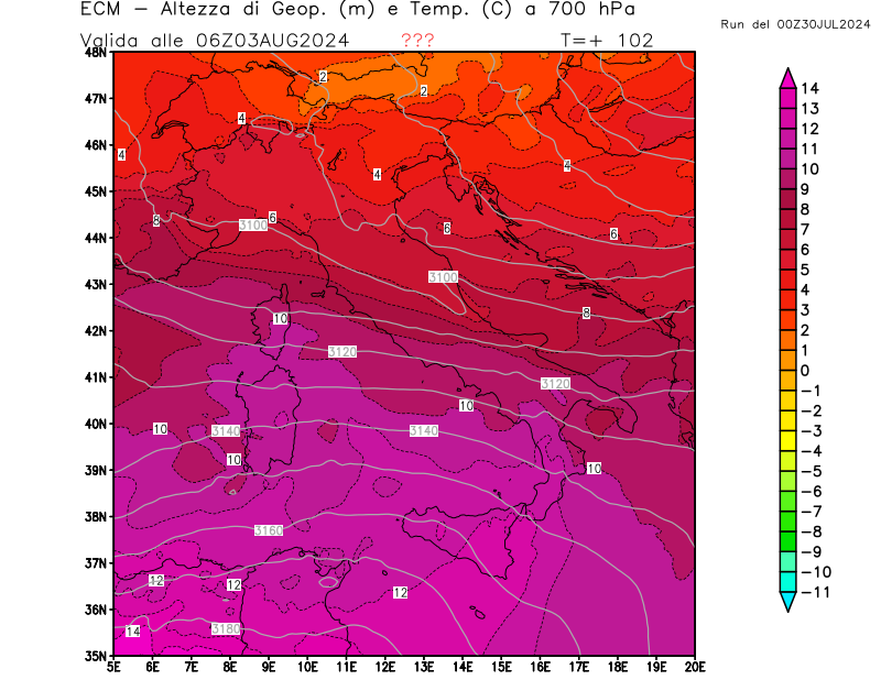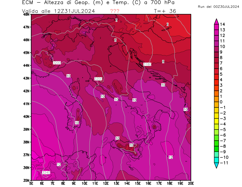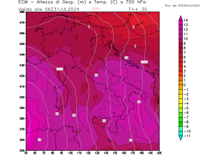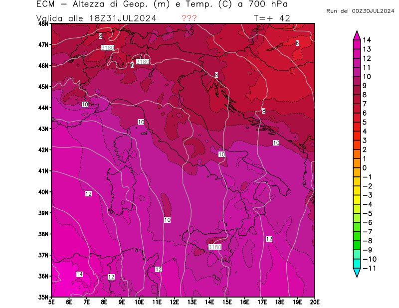 Altezza di geopotenziale (m) e Temperatura (°C) a 700hPa