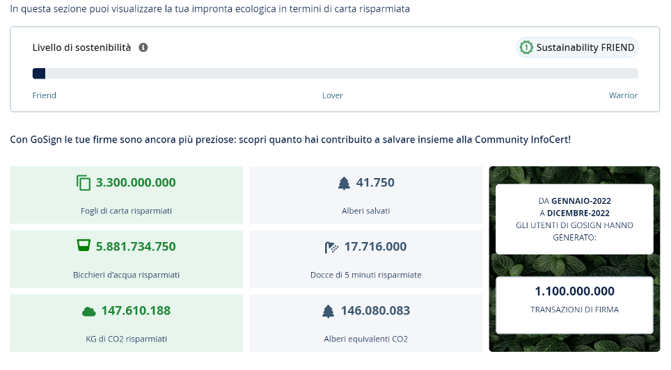 Inoltre, con GoSign, puoi verificare la tua impronta ecologica attraverso la sezione riportata qui sotto: