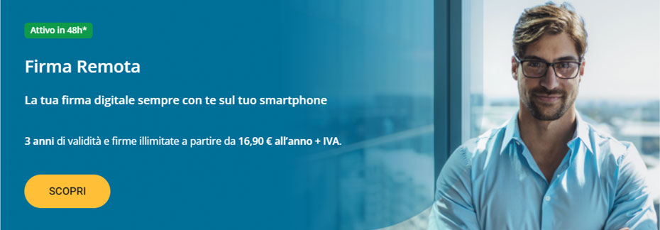 La Firma Remota è la soluzione ideale per chi ha bisogno di firmare digitalmente un documento senza l’utilizzo di alcun dispositivo fisico. Essendo caratterizzata dalla totale assenza di componenti hardware, è possibile averla con sé in qualsiasi momento, su PC o smartphone, in totale sicurezza.